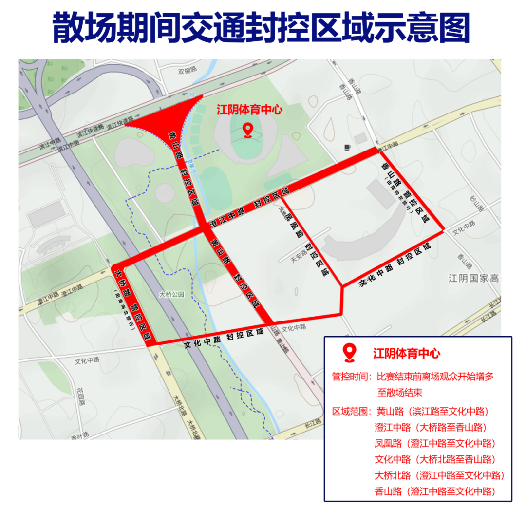 赛后:黄山路(滨江路至文化中路)、澄江中路(大桥路至香山路)、凤凰路(澄江路至文化中路)、文化中路(大桥北路至香山路)、大桥北路(澄江中路至文化中路)、香山路(澄江中路至文化中路)。